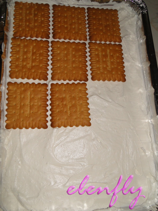 Στρώνουμε σε ένα ταψί τα μπισκότα